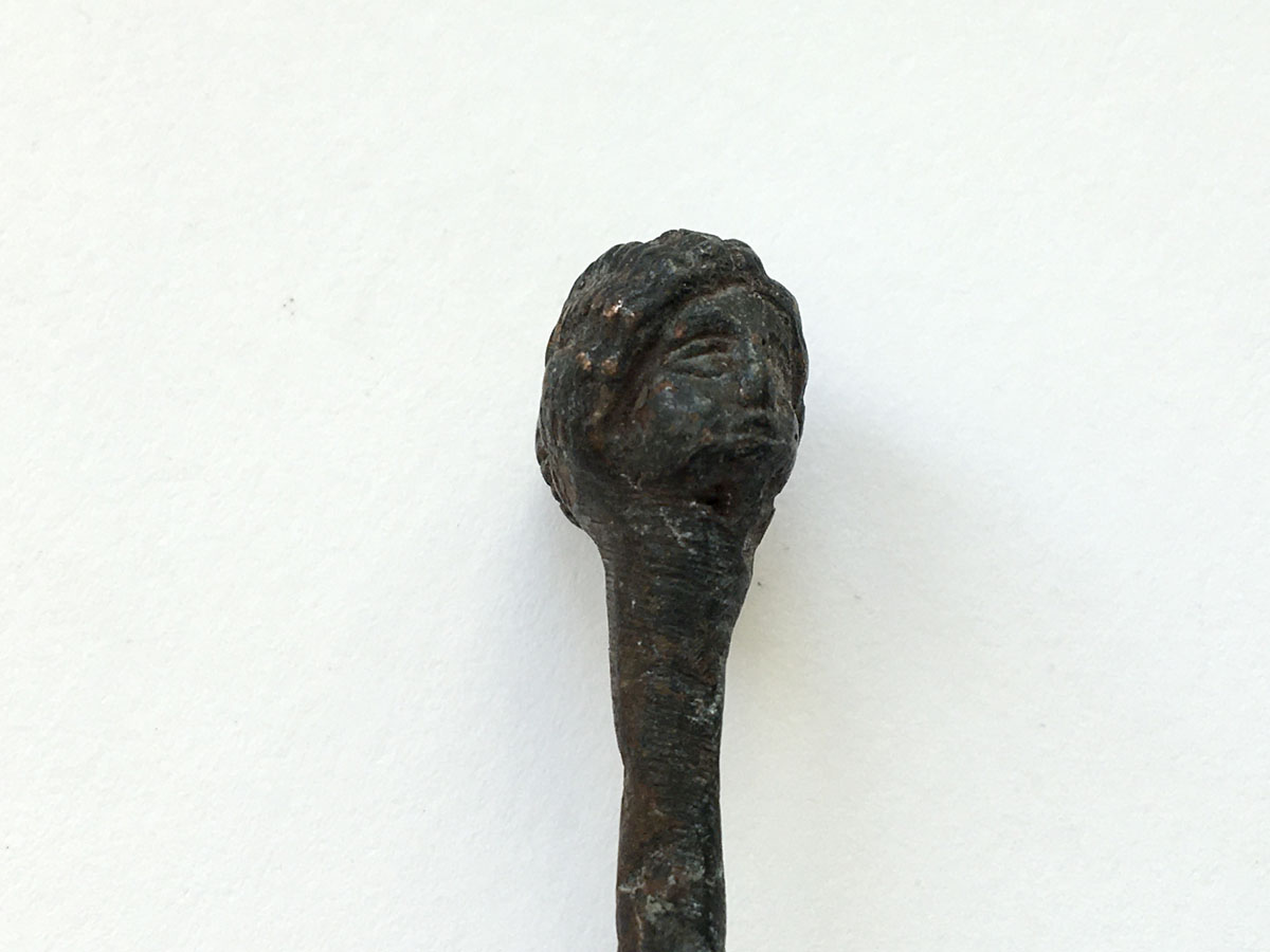 Solche Haarnadeln dienten römischen Frauen nicht nur als praktisches Hilfsmittel zur Fixierung aufwendiger Frisuren, sondern hatten zugleich eine repräsentative Funktion. Der Frauenkopf als Ziermotiv könnte auf ein Idealbild weiblicher Schönheit verweisen oder möglicherweise auf eine Gottheit wie Venus oder Juno.